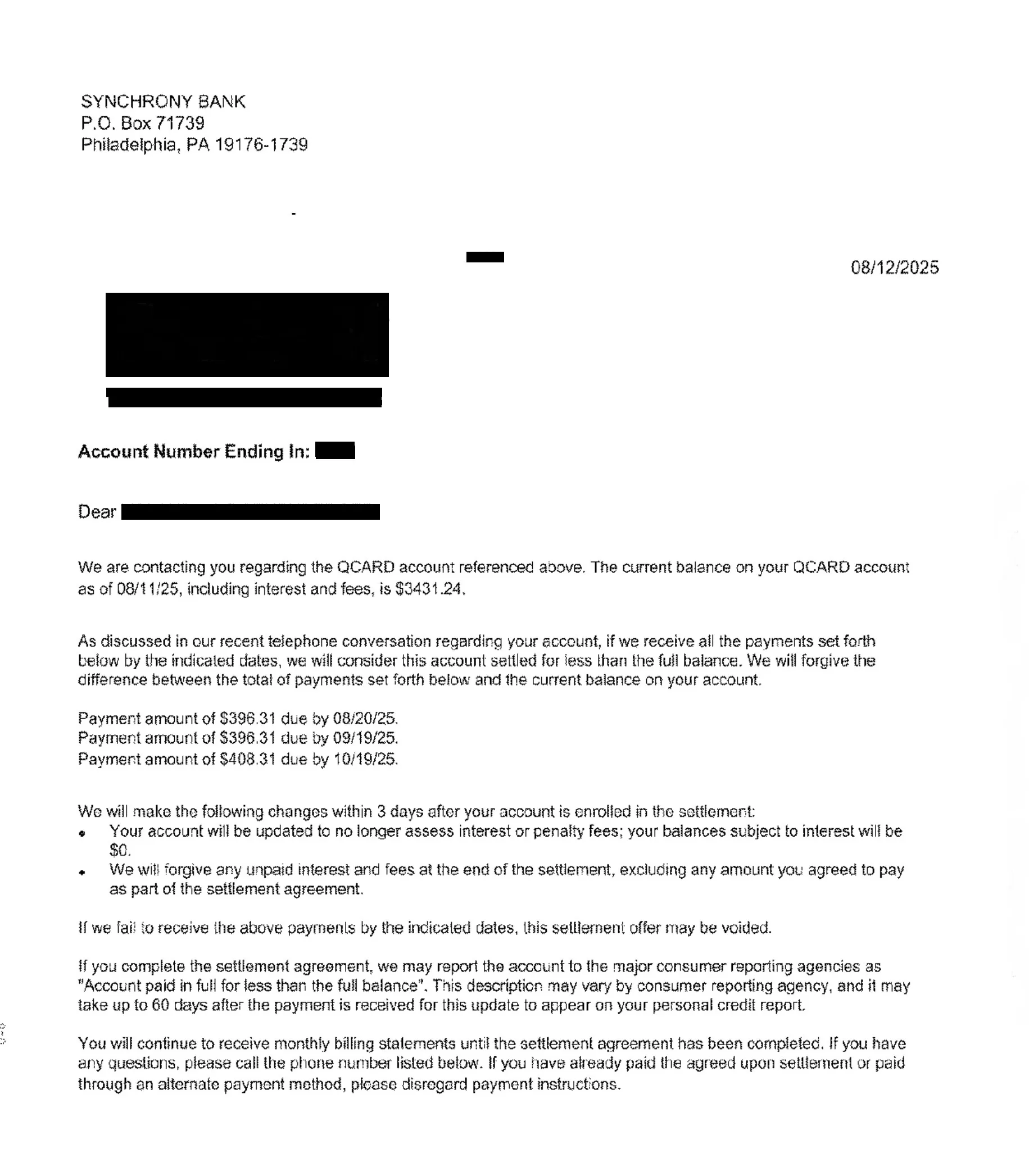 The following is a debt settlement letter for an account with Synchrony Bank (QCard). The creditor agreed to settle the account for less than the full balance, based on a three-payment plan. In this case, the client paid a total of $1,200.93 on a balance owed of $3,431.24, resulting in a savings of over 65%.