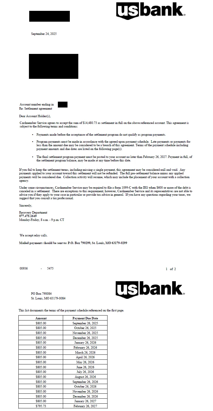The following is a debt settlement letter for an account with US Bank. The information below reflects the final negotiated terms as received by the client. In the letter, you can see the final settlement resolution, where the client saved over 50%. They paid only $14,480.73 on a balance owed of $28,961.