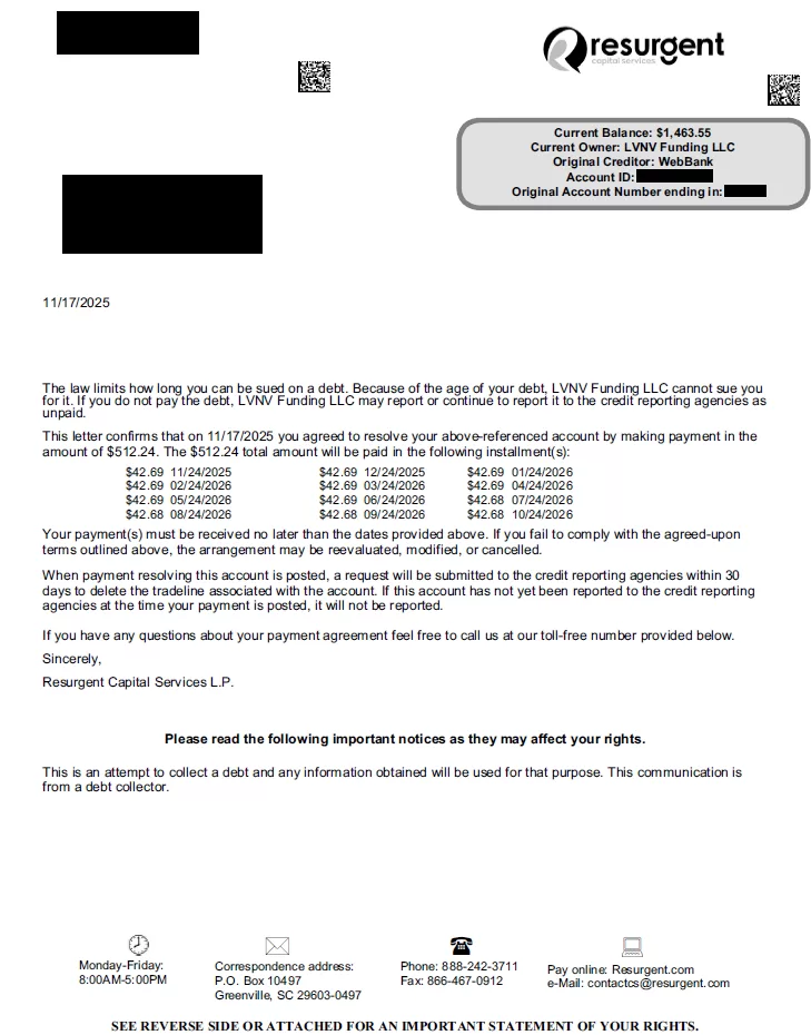 Web Bank Debt Settlement Letter From November 2025