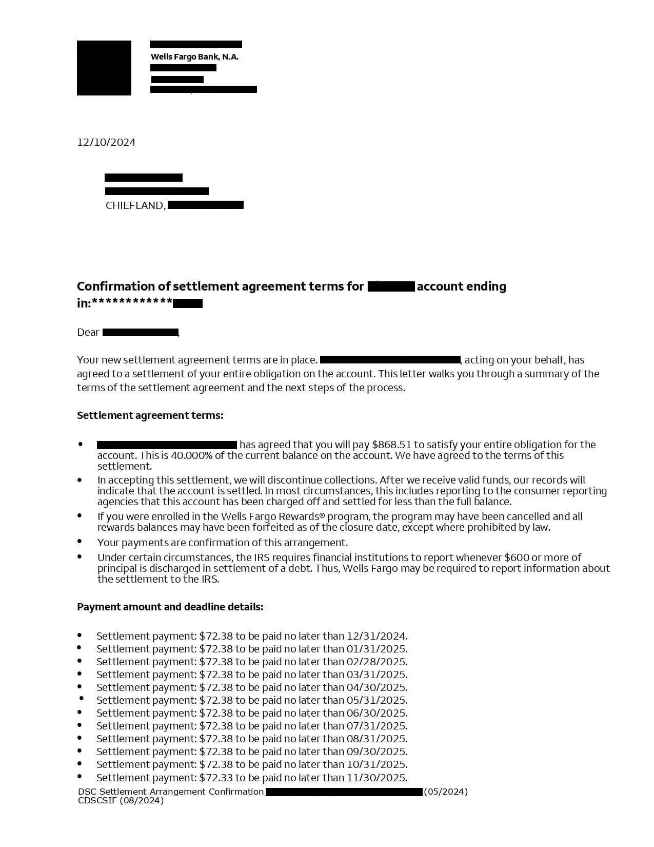The following is a debt settlement letter for an account with Wells Fargo. In this case, the client saved 60% on their balance, paying only $868.51 out of the total owed amount of $2,171.27.
