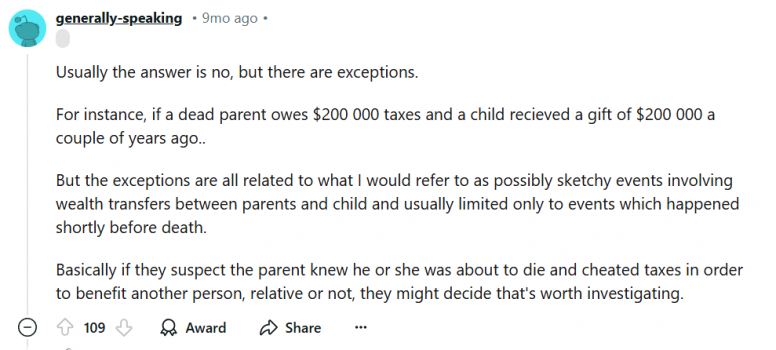 Another user inquired whether he needed to pay off his deceased father’s IRS debt. One reply clarified that generally, heirs are not responsible for tax debt, but exceptions may exist depending on the type of assets or account structures.