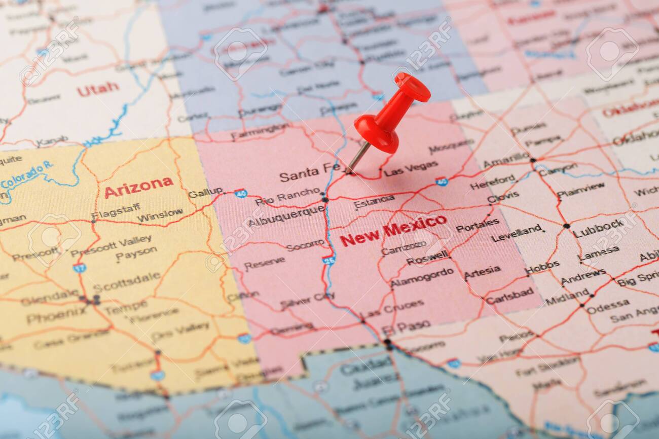Red clerical needle on a map of USA, New Mexico and the capital of Santa Fe. Close up map of new mexico with red tack, US map pin